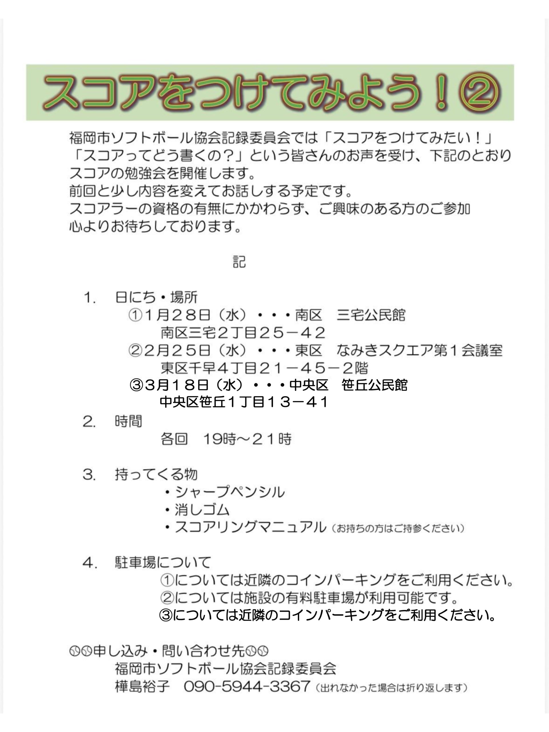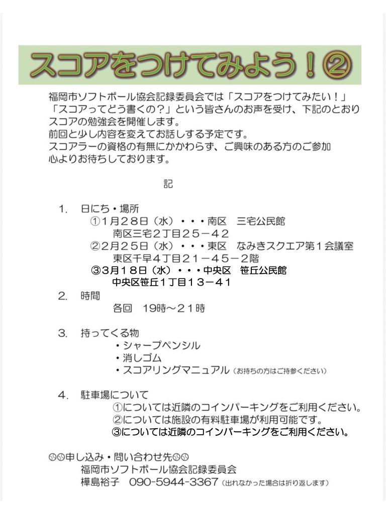 福岡市ソフトボール協会から、記録委員会が開催いたします「記録勉強会」のお知らせです。2月25日(水)になみきスクエアにて開催いたしました記録勉強会には、多数のご参加をいただきありがとうございました。 3月は、18日(水)に笹原公民館にて行います。 スコアラーの資格の有無にかかわらず、興味のある方はぜひご参加ください。 参加される場合は、樺島記録長へ申し込みをお願いいたします。連絡先、その他の詳細はPDFをご確認ください。「スコアをつけてみよう!」②よろしくお願いいたします。